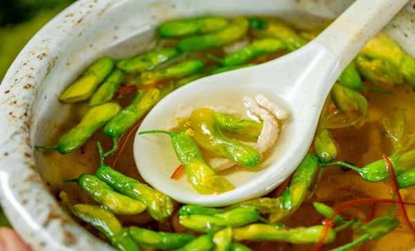 金雀花在水中汆过,就是一碗黄白绿三色羹汤,不用调味,喝起来有一股清甜淡雅之味。