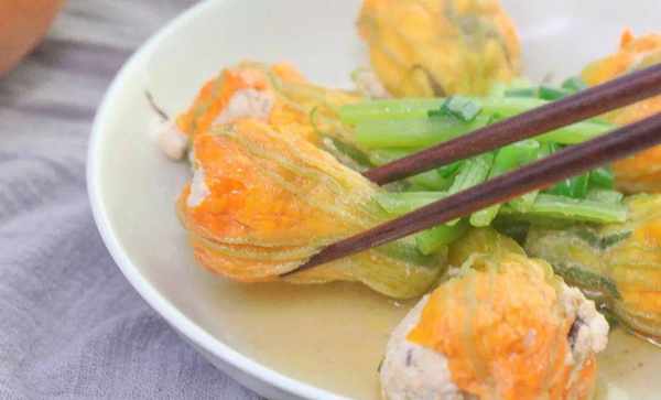 经典的瓜花酿,以猪肉、香菇、豆腐等搅拌做馅,酿入去掉花蕊的南瓜花囊内,封口煮熟。