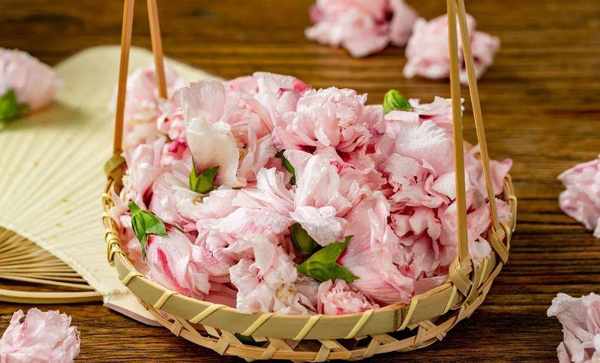 一般食用樱花会用八重樱,但樱花香味清浅,经典吃法还得是盐渍,先用盐腌,再用白梅醋泡,最后摊开晾晒。
