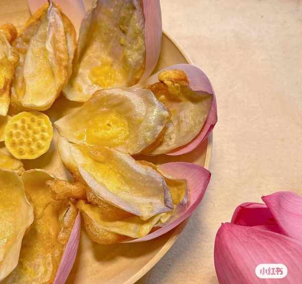 当地人会做一道炸荷花,选荷花最内层的嫩蕾,清洗后挂上鸡蛋面糊炸制,出锅撒上白糖吃。