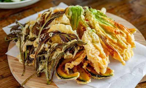 要是裹上面糊,入油锅炸至金黄酥脆,就是南瓜花天妇罗。