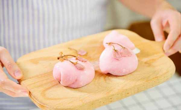 这款樱花雪媚娘,外层是糯米皮,里头包裹樱花味冰淇淋和鲜草莓,面上点缀盐渍樱花,美得人心都化开~