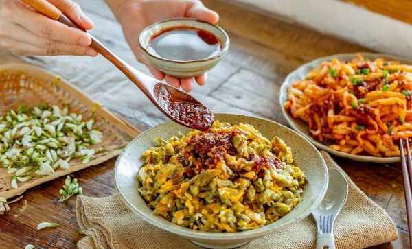 当槐花裹上蛋液,外层柔嫩内里娇脆,施以一勺油泼辣子,竟能吃出肉荤味儿~