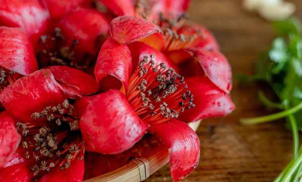 木棉花,挂在枝头是可观可赏的火烧云,掉落在地,就成了盘中餐。