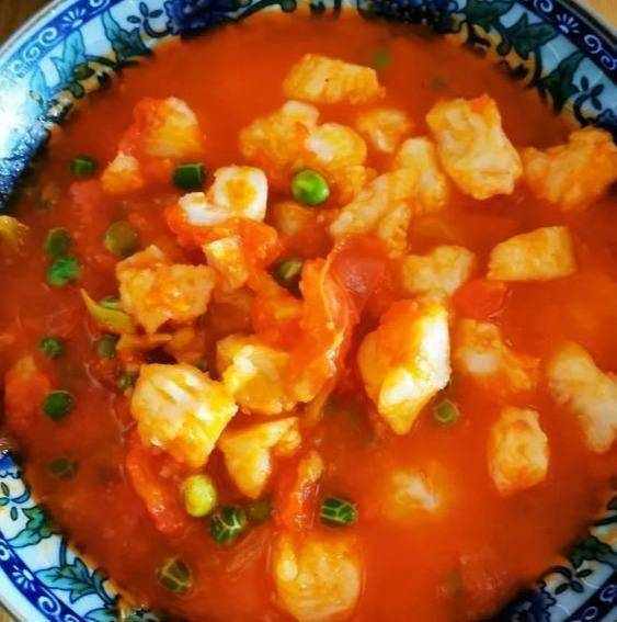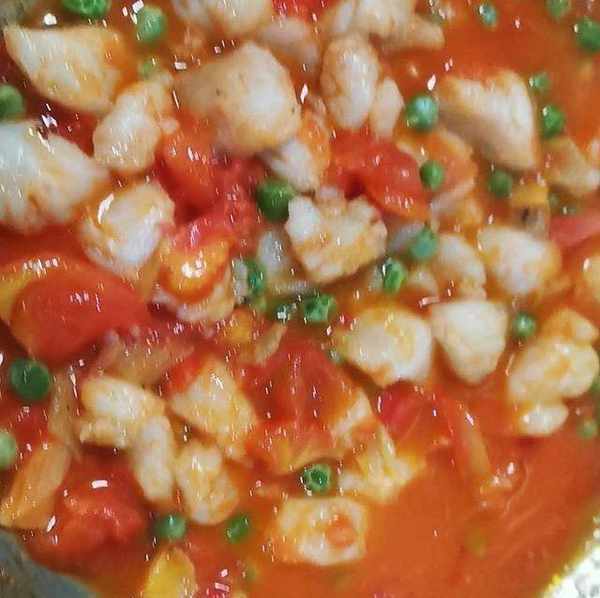 1、将龙利鱼从包装袋中取出,解冻,洗净,切小块。将西红柿洗净,去皮并切成小块。将青豆洗净备用。