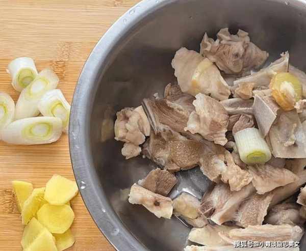 ⑴:先将猪骨汤切成块,将猪骨块在水龙头下冲洗干净,然后放入容器中,加入一勺盐和水,可以将猪骨汤的血水吸干,服下出来以备后用。