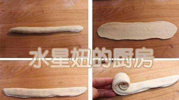 松弛后,搓成长条,用擀面杖擀开,再对折,卷起来,一端压到底做成饼干,松弛15分钟