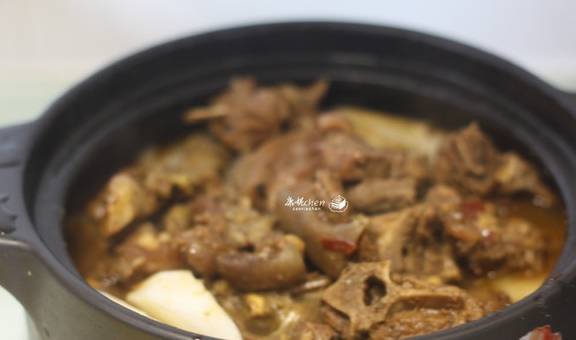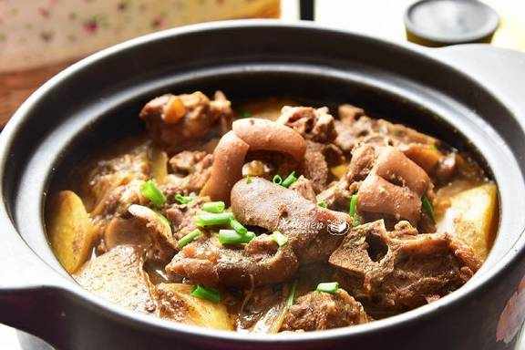 7把焖好的羊肉和萝卜块倒入砂锅中,盖上盖子,焖15分钟