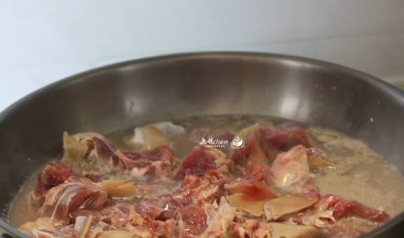 5加入羊肉块,翻炒,把羊肉炒得金黄金黄