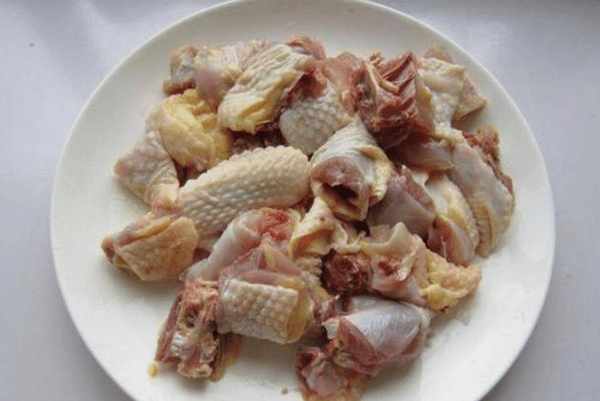 烹饪步骤2:将鸡肉切块,用清水将鸡肉洗净(主要是表面有血水和血沫),很多人只知道焯水,其实这个方法是错误的。