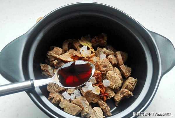 第五步:锅中加入冰糖,将冰糖炒至牛肉上色,使牛肉上色。你需要控制火候以防止牛肉变苦。加水,加入砂糖不断搅拌,待颜色变成干蛋黄。把牛肉从火上移开。