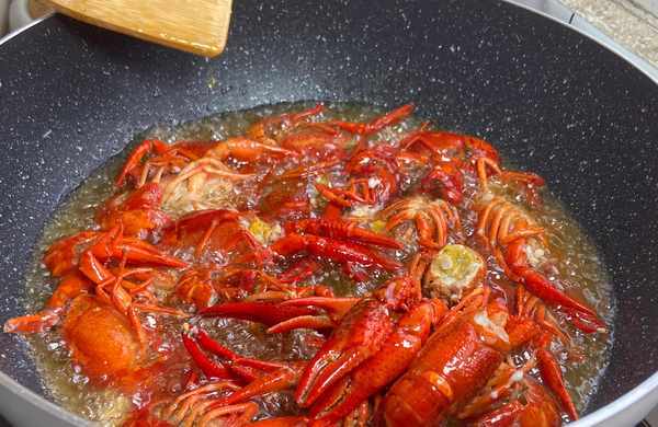 3、所有的配菜备起之后起锅,锅里面多倒一些食用油,把处理好的小龙虾下入油锅中。开火把小龙虾炸至30秒钟的时间,记得用热油炸制。等你看到小龙虾表面变色的时候完全变为深红色,这时就可以捞出来了,不要过油过的太久,不然的话会影响到口感。过完油的小龙虾控油捞出来装入大碗里面备用。