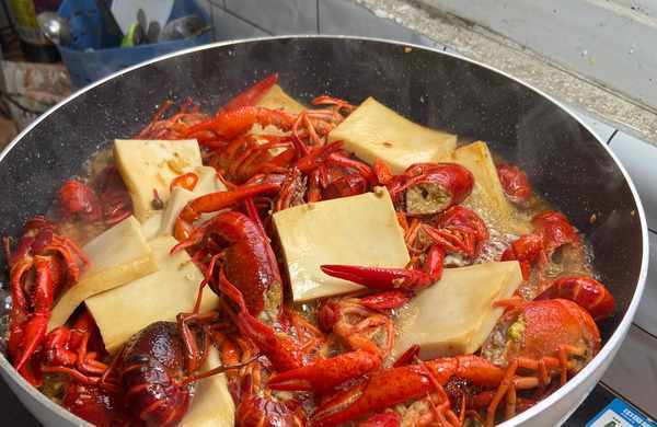 5、接着再把千叶豆腐下入锅中翻炒一分钟的时间跟着,再把小龙虾一并倒入锅中,继续翻拌均匀,大概翻拌一分钟时间,然后往里面倒入一瓶啤酒,盖上盖子闷上几分钟的时间,中途时不时的给他翻动一下。