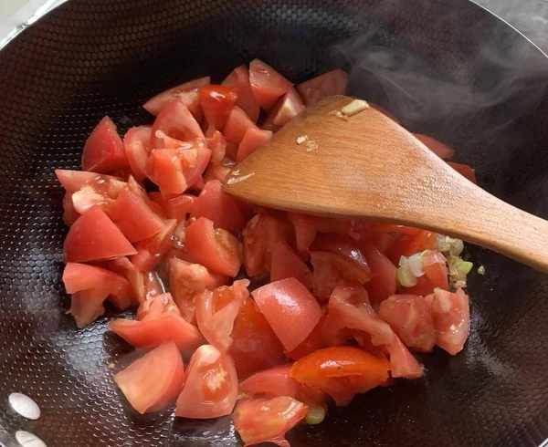 再烧油爆香葱姜,倒入木耳、黄花菜翻炒几下加入西红柿继续翻炒。
