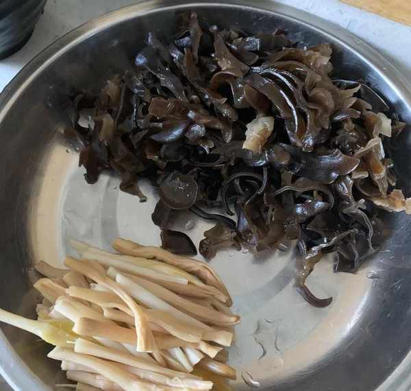 西红柿去皮切丁,木耳黄花菜提前浸泡后洗净洗净切碎,三个鸡蛋打散备用。