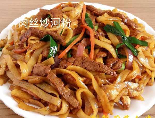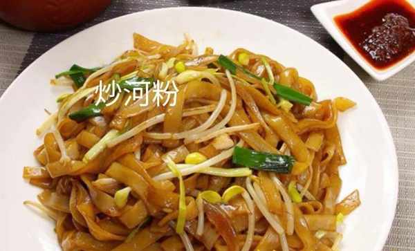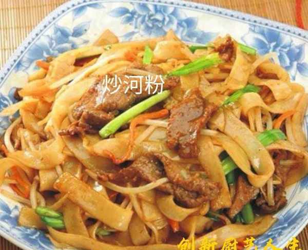 炒河粉,此点是选用广州沙河粉与肉丝(牛肉、猪肉、鸡身材肉等)、绿豆芽、火腿丝、韭黄段(或青蒜)等炒制而成。成品沙河粉薄而时尚、韧而滑爽的风味,又配上肉丝的鲜香。因此深受食客们的喜爱。