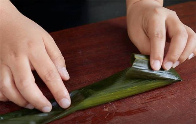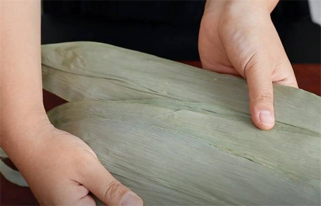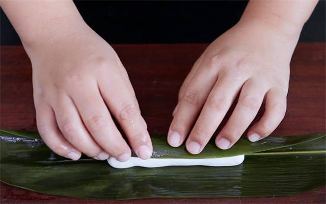9.拿一张粽叶出来,把刚才揣好的糯米面团放在中间,然后两边分别向里对折。