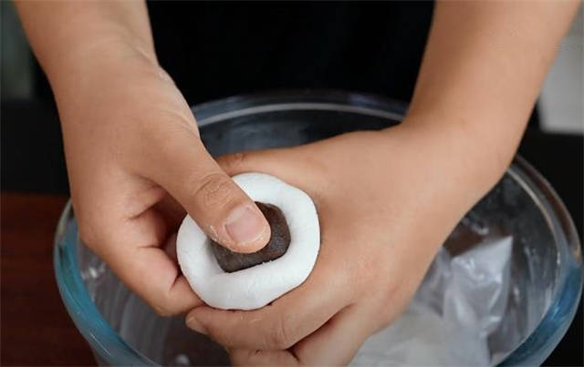 7.直接揪一小块面团当作剂子,在掌心揉匀,揉到湿润的状态之后,在掌心搓圆,大拇指向下按压,中间填进去一颗豆沙馅,利用虎口处慢慢向里收。