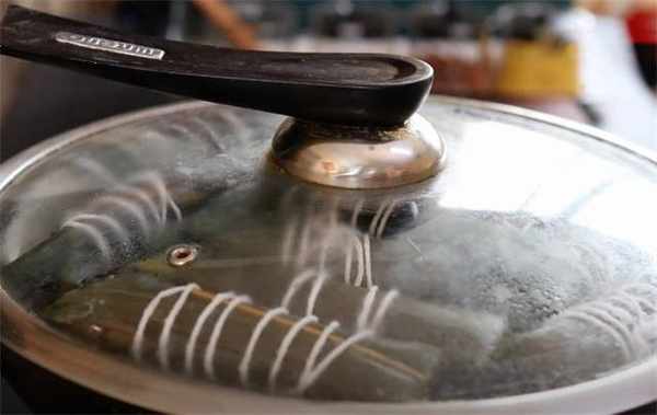 4.提前烧锅热水,里面放上2g的食用碱面,相对于食盐来说,碱面可以更好的让粽叶中的纤维在热水中伸展,这时候我们把粽叶放在沸腾的锅里煮上10分钟。