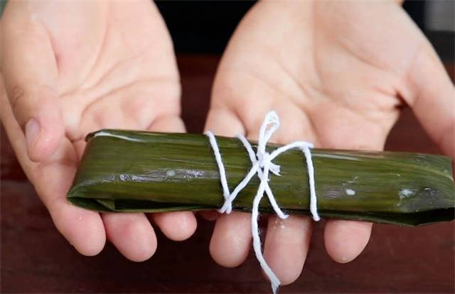 11.这个是包粽子用的棉线,咱们轻轻的把它缠起来,最后的收口处打一个结,这个坯子就做好了。