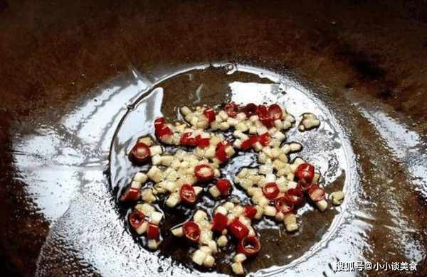 烹饪步骤5:准备一个干净的锅,加入少许食用油和蒜末,与茄子一起翻炒,将茄子炒软,加入少许小米椒。