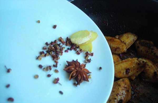 5、加姜和花椒粒炒出香辣味,爱吃辣味重的,可以加辣皮子一起炒出香辣味(老抽少加一些,要不发黑)