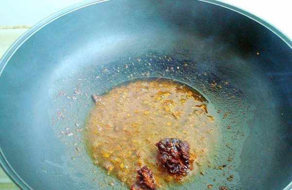 3、热锅凉油,油的稍微加少一些,要加火锅底料,把底料炒融化以后出香味出红油。