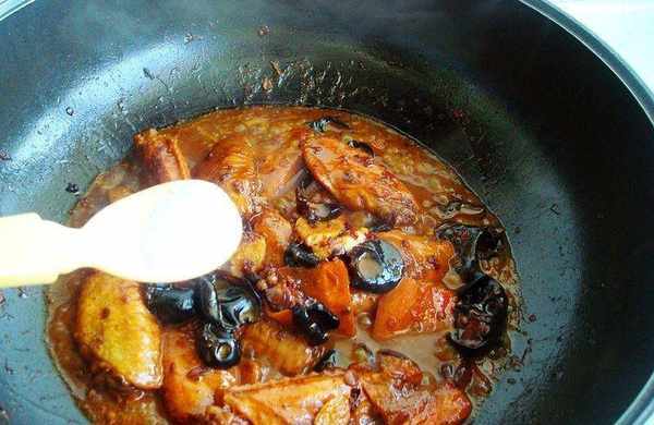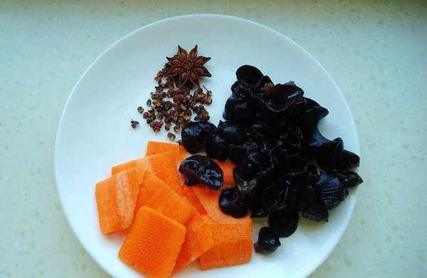 辅料:植物油油、盐、火锅底料30克、老抽5克、姜10克、花椒粒2克、八角一个、泡发的木耳50克。