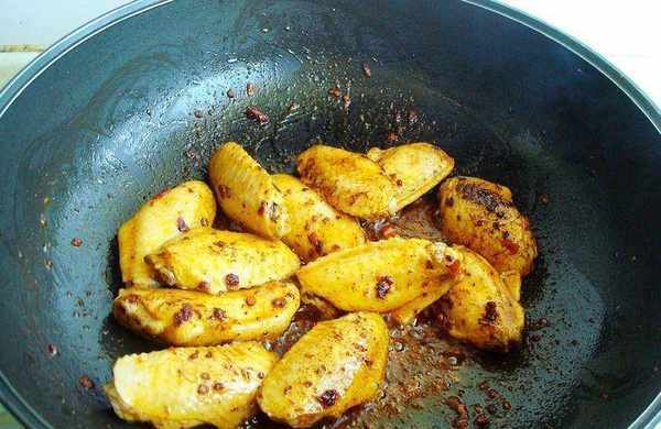 4、加鸡翅翻炒均匀,加料酒和老抽再次翻炒出鸡翅的香味以后
