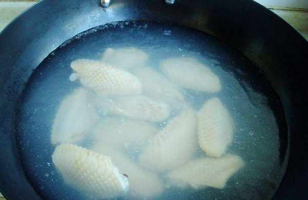 2、把鸡翅洗净,下到凉水里煮开,去掉血沫,捞起来这样可以去腥味,记住不要用开水焯鸡翅,那样鸡翅血水不易出来。