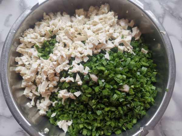 第三步:韭菜切好以後放入盆中,把豆腐切成小丁放入。豆腐和韭菜搭配味道和口感都很棒,而且豆腐含有豐富的鈣質,平時多吃可以補鈣質,是很不錯的食材。