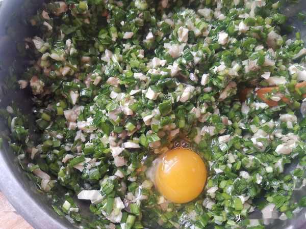 第四步:把餡料放入花生油拌勻,加鹽調味,然後一部分打上一個雞蛋拌勻。新鮮雞蛋是餡料鮮美的關鍵,鮮雞蛋不要一次全部打入,要包一部分,然後再打入雞蛋,如果一次全部打入,會出水不好包。