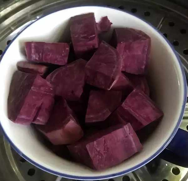 1、将我们买来的200克的紫薯洗干净去皮,然后切成薄薄的片状或者块状,放到蒸锅中蒸熟,一般来说我是蒸十五分钟左右就会出锅了,十五分钟左右紫薯就已经熟了。