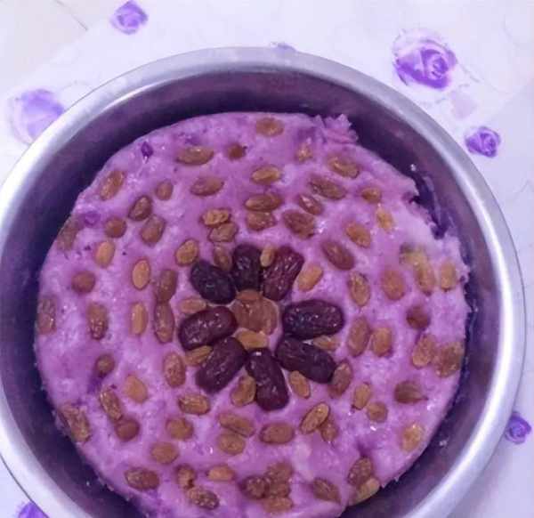 7、紫薯面糊二次醒发好了以后,我们将准备好的红枣去核,放在面团表面,如果喜欢吃葡萄干的话,可以放入我们喜欢吃的葡萄干,喜欢吃瓜子儿了也可以放上几粒瓜子仁,喜欢吃蔓越莓的可以放一些蔓越莓干,总之你喜欢吃什么就可以放什么。