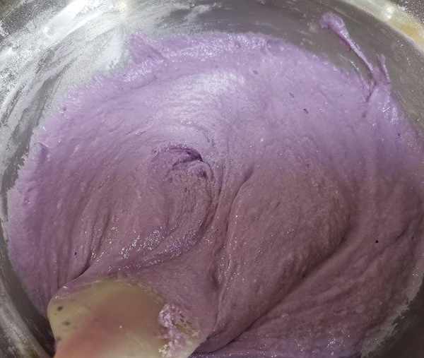 5、搅拌均匀没有干面粉以后。放置在温暖的地方醒发至两倍大。紫薯面糊醒发好了以后,我们用筷子不断搅拌面糊,给面糊排气。