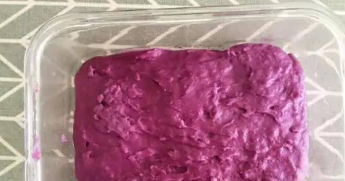 6、排好气以后,我们找到一个可以高温加热的容器。在容器底部喷上一层熟的食用油,然后将我们搅拌好的紫薯面糊倒入到容器当中,将表面抹平。进行二次醒发,二次醒发的时间维持在15分钟左右。