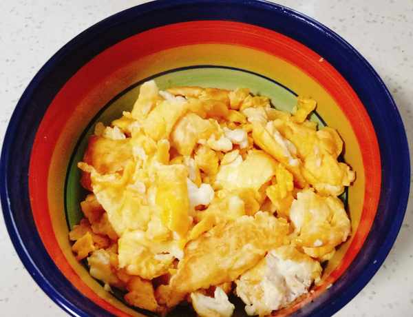 起锅倒入食用油,炒鸡蛋,边炒边将鸡蛋铲碎,盛出;
