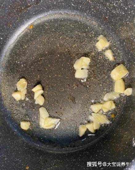 三、锅底放猪油和食用油,加适量蒜瓣蒸香,倒入适量红苋菜,大火快速翻炒,待叶变软。.