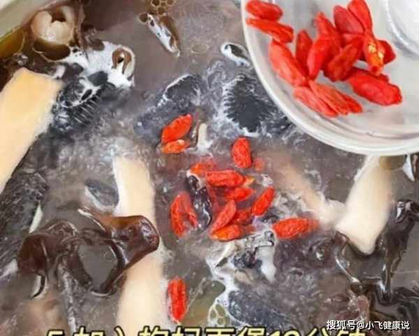 第六步:转小火继续炖,加入少许枸杞子、少许盐和胡椒粉、少许香油或食用油继续煮几分钟。