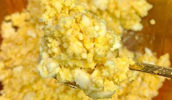 加入一点咸盐和香油,捣碎后是这种状态,独有的鸡蛋大蒜香味立刻弥漫开来,闻着就忍不住流口水,这样的鸡蛋大蒜组合,南方朋友没有吃过也没有见过,在北方,这个菜是酒席上的硬菜,上桌就被抢光,超级下饭。
