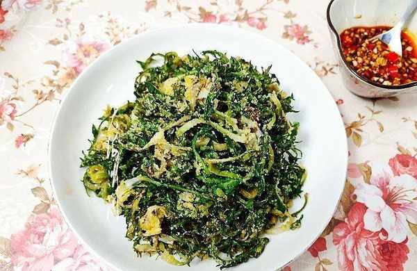 做法:1、采摘回来的婆婆丁洗净,然后加点食用油拌匀,锁住水分。2、玉米面和面粉按照1:1的比例混合搅拌均匀,慢慢添加到婆婆丁里,边添加边搅拌,使婆婆丁均匀地裹上面粉,平摊在蒸屉中。3、锅中加入适量的水,大火烧开,上屉大火蒸5~8分钟左右。4、大蒜去皮洗净剁成蒜蓉,小米辣洗净切段,放入小碗中,加入白糖、蚝油、三月鲜10克轻盐原汁酱油、香醋、辣椒油充分地搅拌均匀。5、出锅,迅速划散,蘸料汁吃,顶饱抗饿燃脂。