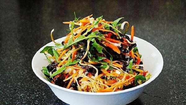 做法:1、黑木耳泡发后洗净焯水切丝。2、金针菇去掉根部洗净,焯水后捞出过冷水控净水分。3、婆婆丁洗净撕成叶片,大蒜去皮洗净切碎。4、胡萝卜去皮洗净切丝,焯水后过冷水捞出控净水分。所有食材装入盆中,加入盐、白糖、轻盐酱油、香醋、香油拌匀,装盘。