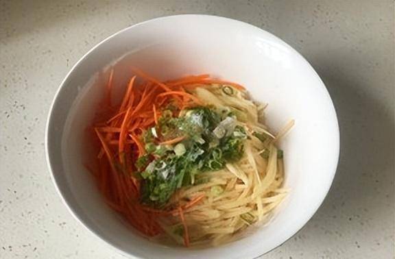 1.将土豆和胡萝卜洗净去皮,擦拭花丝(站起来擦拭花丝,使其成型),切碎青葱,在青葱上撒盐和十三种香料,然后倒入芝麻油,搅拌片刻,腌制片刻(腌制后的蔬菜丝变软,更有利于下一步操作)。