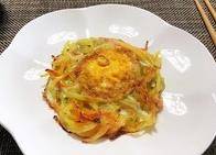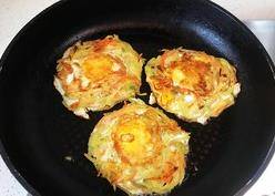 一面煎黄,另一面翻过来。如果锅里的油少了,你可以在蔬菜蛋糕的缝隙里倒适量的油,这样更好更美味。整个过程大约需要4分钟(翻转后,你可以在中间的鸡蛋上撒一点盐和胡椒,鸡蛋会更美味)。
