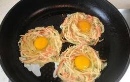 在不粘锅中加入适量食用油并加热。然后用筷子将一小团切碎的蔬菜放入锅中。在切碎的蔬菜中间开一个小巢,然后把一个鸡蛋放进锅里,用中、小火煎(注意根据锅的厚度及时调整热量,如果热量太大,很容易煎)。凝固后,摇动平底锅,使锅中的油分布更均匀,或盖上平底锅,这样鸡蛋凝固得更快(注意薄薄的蔬菜丝,这样更容易油炸)。