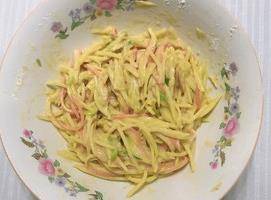 1.切碎的蔬菜腌制后,加入1或2个鸡蛋,搅拌均匀。