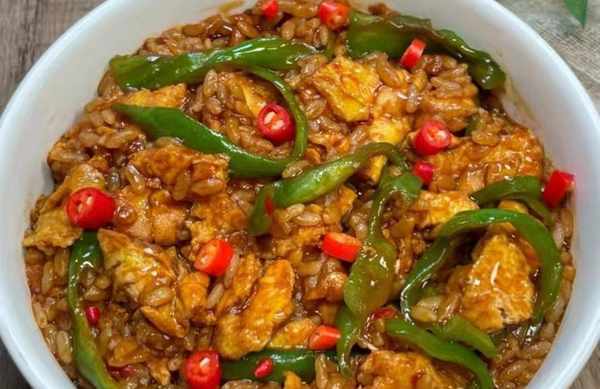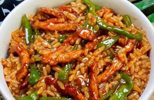 (4)起锅烧油,起温后加入腌制好的肉丝翻炒至变色,加入蒜末翻炒起香,再加入青椒丝翻炒至断生,最有加入米饭、准备好的料汁搅拌均匀,调至中小火煮至汤汁浓稠即可。