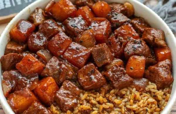 (4)锅中留油,加入土豆翻炒至表面金黄,加入洋葱起香,加入牛肉、煮好的大米、料汁搅拌均匀,调至中小火煮至汤汁浓稠即可。