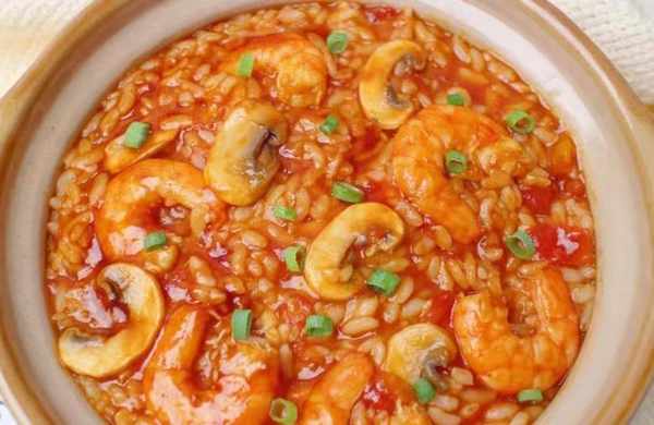 (4)锅中留油,爆香蒜末,加入番茄翻炒出汁,加入蘑菇片翻炒片刻,加入煮熟的米饭、虾仁、备好的料汁翻炒均匀,调至中小火煮至汤汁浓稠即可。