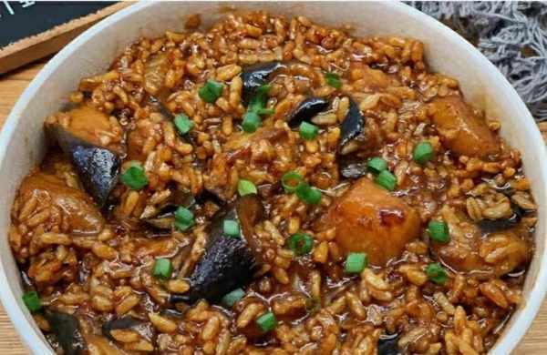 (3)起锅烧油,起温后爆香葱花、蒜末,加入土豆翻炒至表面焦黄,再加入茄子翻炒至软,最后加入煮熟的米饭、准备好的料汁搅拌均匀,调至中小火煮至汤汁浓稠即可。